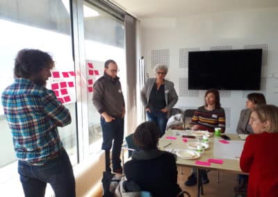 Après quelques mots d’accueil par Jean-Yves Battagli, Directeur de la communication, Valérie Vacchiani a pris la parole en tant que chef du projet de restauration de la tour. L’occasion d’apprendre que cette tour, « notre » tour, est centenaire ! Imaginée comme une tour d’orientation, illustrant la modernité de Grenoble, elle fut érigée en 1924 à l’occasion de l’exposition internationale de la Houille Blanche et du Tourisme, et fut la première tour à avoir été construite en béton armé dans le monde. Carole Gaillard, chargée de communication à la Ville de Grenoble, a ensuite pris la parole pour expliquer son initiative auprès de Com2Grenoble, à savoir partager les enjeux de communication autour de la restauration avec un parterre de communicants. Place à l’animation donc, avec 3 ateliers formés sur le champ et 3 techniques d’animation ! Des post-it, des feutres et des paperboards : il n’en fallait pas plus aux 25 participants présents pour laisser libre cours à leur créativité…